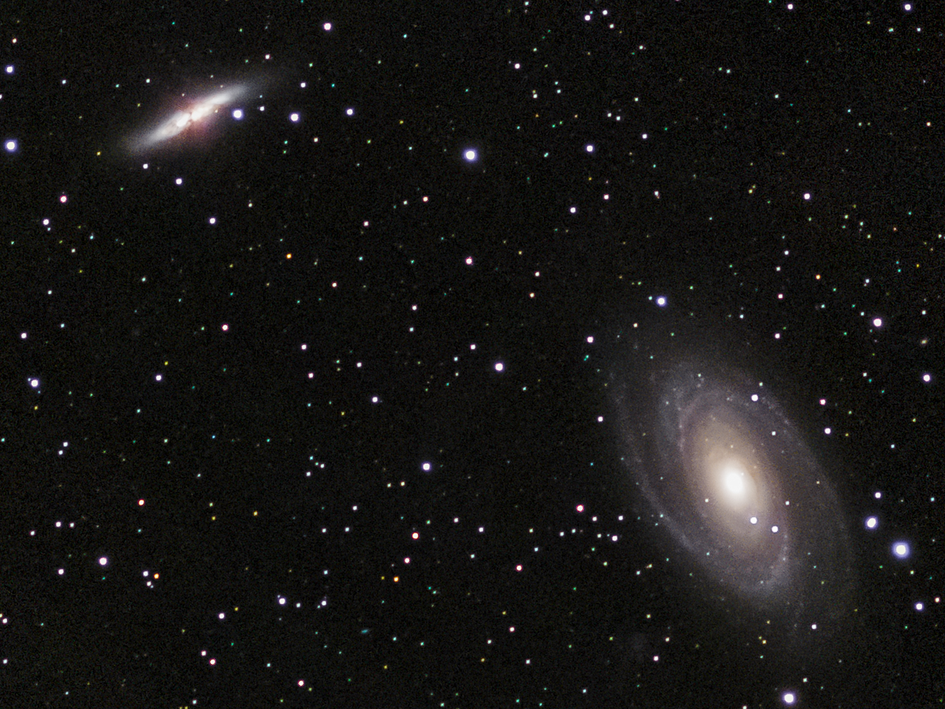 M82:sta tekee erityisen sen keskialueelta tapahtuva kaasupurkaus. Nuorten tähtien ja supernovien energia puhaltaa kaasua ulos galaksista molempiin suuntiin. Nämä purkaukset näkyvät kuvissa punertavina filamentteina – mutta ne alkavat erottua kunnolla vasta pitkällä valotuksilla, kuten tässä minun kahden yön sessiossa.