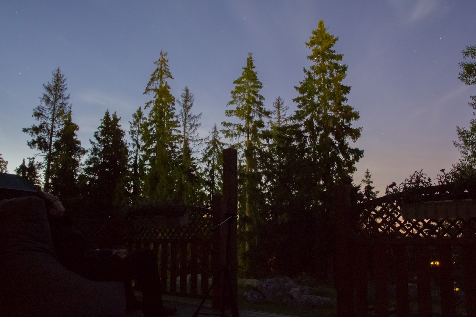 En ole aikaisemmin onnistunut kuvaamaan tähdenlentoja, joten odotukset eivät olleet valokuvauksen suhteen korkealla. Olisin tyytyväinen jos edes yhden pienen viirun saisin kuvaan tarttumaan. Laitoin kameraan ensiksi asetukset f4 ja ISO800 sekä valotusajaksi laitoin 30 sekuntia. Pistin kameran jalustalle ja otin kuvanvakaajan sekä automaattitarkennuksen pois päältä. Tuo f4 oli kyllä joku omituinen päähänpisto, koska Sigmasta löytyy suurempaakin aukkoa aina f2.8:aan asti. En voi edes syyttää viskiä, koska en ollut silloin vielä sitä maistanut. Jotenkin ajattelin, että menee varmemmin fokus kohdalleen, kun tarkoituksena oli säätää tarkennus manuaalisesti. No, joka tapauksessa outo päähänpisto. Myöhemmin yöllä taivaalle alkoi kertyä yläpilveä, joka heijasti kaupungin valoa ja teki taivaasta aavistuksen vaaleamman, siksi silloin lyhensin valotuksen 15 sekuntiin.