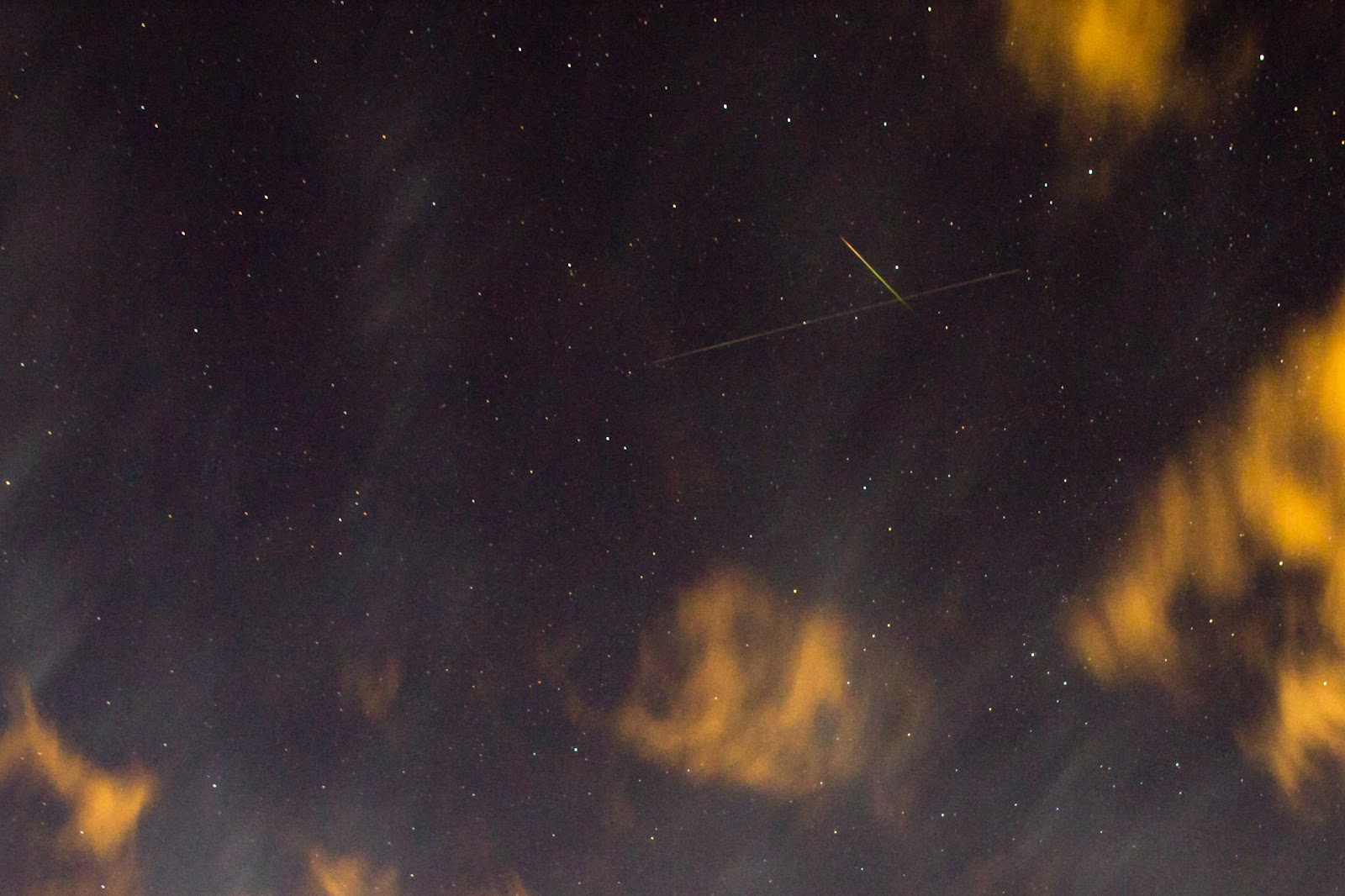 Satelliitin ja perseidin kohtaaminen. Satelliitti matkasi oikealta vasemmalle ja jätti vanan kuvaan. Perseidi oli lyhytkestoinen ja leikkasi satelliitin radan ylhäältä alaspäin.