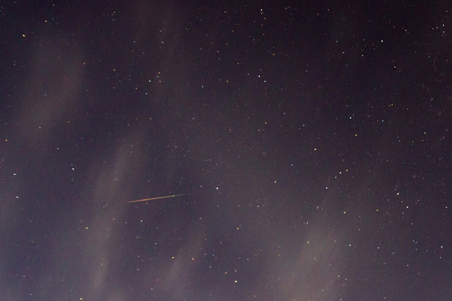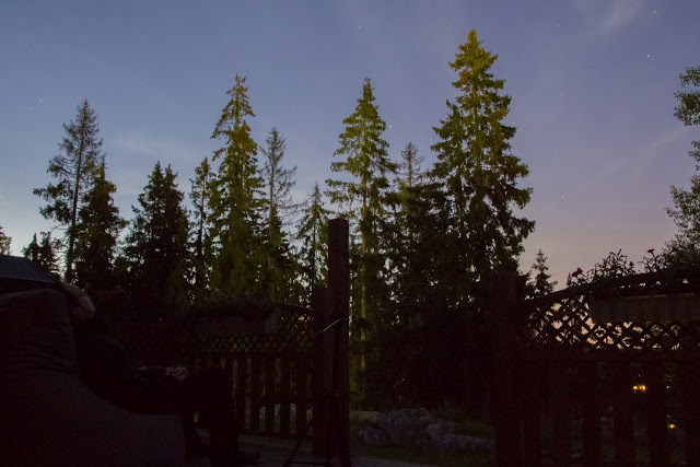 Eilen illalla taivas oli lähes selkeä, vain pieniä pilvenhaituvia lipui taivaalla. Nostin säkkituolin terassin laidalle ja viritin kameran viereeni tikuttamaan tasaiseen tahtiin kuvia taivaalta. Siinä säkkituolissa oli mukava istua, ihmetellä taivaan tapahtumia ja siemailla Cardhu-viskiä.