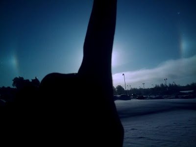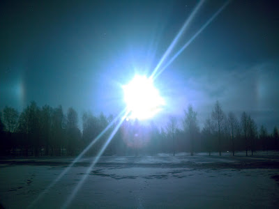 Tänä aamuna sain vihdoin pitkästä aikaa otettua kuvia myös tänne blogin Tähtitaivas-osioon. Aamulla töihin mennessä huomasin kauniin halon auringon ympärillä ja pakkohan sitä oli jäädä kuvaamaan vaikka töihin oli jo kiire. Halo johtui todennäköisesti ilmassa leijuvista jääkiteistä, koska pakkasta oli n. -15C. Kyseessä on ilmeisesti tyypillinen 22 asteen rengas, mutta joka tapauksessa sinisen ja punaisen värejä hehkunut ympyrä näytti upealta. Yritin kuvata ilmiötä kännykkäkameralla, mutta valitettavasti kovin hyvin se ei kuvaan tarttunut.