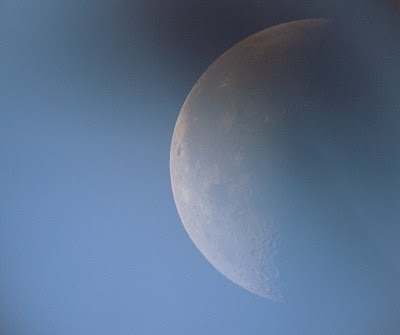Nämä pohjoisen yöt ei sitten millään tunnu pimenevän, joten täytyi jatkaa päivähavaintoja. Huomasin puolikuun keskellä kirkasta päivää taivaalla, joten pakkohan sitä oli ihmetellä kuuta putken läpi näin ensimmäistä kertaa. Yllättävän mukavastihan se näkyi keskipäivälläkin (klo 13). Nappasin kuusta kuvat k800i:llä ja pinosin yhdeksän BestPicillä otettua kuvaa RegiStaxilla. Okulaarina oli 25mm:n Super Plossl. Käytin pientä suurennosta koska päivä oli niin kirkas ja halusin saada sellaisia kuvia, mihin koko puolikuu mahtuisi kerrallaan. Ihan hyvin kuva onnistui vaikka aurinko porotti täysillä etelässä.