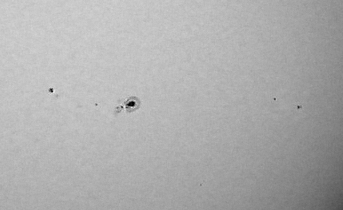 Seuraavaksi otin 2x barlowin välistä ja vaihdoin okulaariksi 25mm:n Super Plosslin, jolloin suurennos oli ”vain” 48x. Viime viikolla sain otettua tällä suurennoksella muutaman todella tarkan yksittäisen kuvan kännykälläni. Nyt keskityin tukemaan puhelinta tarkasti, jotta puhelin pysyisi paikallaan koko BestPicin ajan. Pari sarjaa sainkin onnistumaan, niin että kaikki yhdeksän kuvaa olivat kohtalaisia. Yllä on paras yhdeksän kuvan sarja pinottuna RegiStax4:lla. Kuvasta pystyy erottamaan 963:n lisäksi muitakin pilkkuja, esimerkiksi oikeassa laidassa on pienempi pilkkuryhmä nimeltään 964.