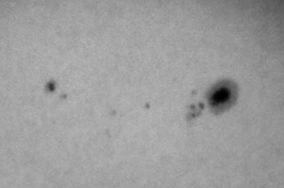 Jatkoin siis k800i kokeilujani auringonpilkkujen kuvaamisessa. Ensiksi kohdistin putken aurinkoon ja sen jälkeen päätinkin laittaa alkuperäisien suunnitelmien vastaisesti yhdistelmän 10mm Super Plossl okulaari + 2x Barlow. Eli suurennosta oli hulppeat 240x. Tälle asetukselle odotukseni eivät olleet korkealla vaikka suht hyvä seeing vallitsikin. Ensiksi yritin ottaa kuvia, että okulaarin aurinkosuoja oli käännetty esiin, mutta kuva-ala jäi aivan liian pieneksi niin isolle ”pilkkuparvelle” kuin 963 on. Lisäksi puhelimen automaattikamera ei saanut millään tarkennusta kohdalleen.