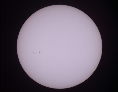 Piti jatkaa kokeiluja kännykälläni (SonyEricsson k800i), kun taivas kerran kirkastui ja SpaceWeatherin mukaan auringossa näkyi mielenkiintoinen pilkkuryhmä nimeltään 963. Ensiksi otin muutaman kuvan suuremmalla suurennoksella 25mm Super Plossl -okulaarilla ja 2x Barlowilla. Sen jälkeen päätin ottaa barlowin välistä ja ottaa kuvia koko auringosta. k800i yllätti minut taas positiivisesti, se osasi tarkentaa itsensä suoraan pilkkuihin. Tästä todisteena yksittäinen kuva. Harmittavasti pilven lonkare tuli auringon eteen ja tarkennuskokeilut jäivät kesken. Tällaisia kuvia olisi ollut hieno pinota päälekäin. Tästä on kuitenkin hyvä jatkaa, toivottavasti huomenna on aurinkoinen päivä. Pilkutkin ovat silloin lähes keskellä aurinkoa. (Tämä bloggeri näyttää pakkaavan kuvia melkoisesti, joten näistä tähtikuvista osa näyttävyydestä katoaa sen myötä)