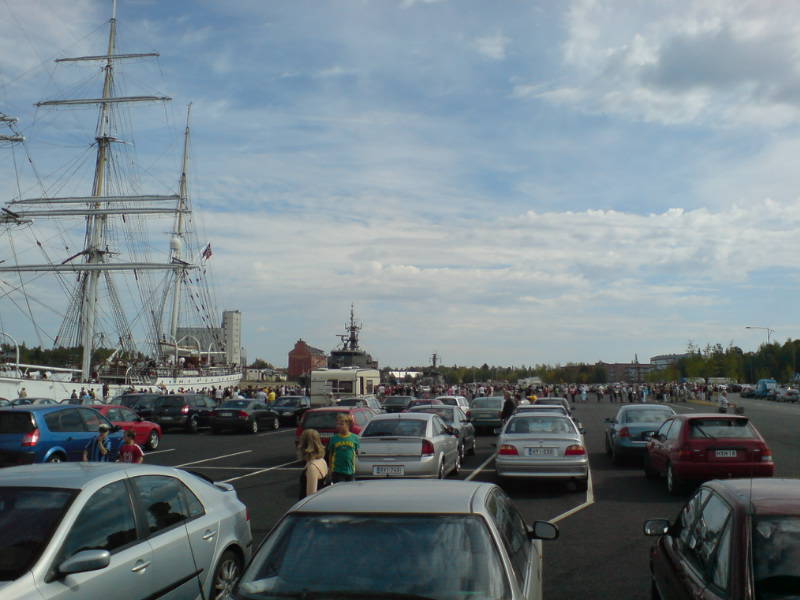 Selvisihän se syy miksi edellisen kuvan parkkilaiva oli Ouluun eksynyt. Täällä on Pohjoismaiset merikadettipäivät. Laivoille oli vapaa pääsy yleisöllä pe ja la kahden tunnin ajan. Tämä oli saanut ihan kaikki suuntaamaan Möljälle. Aivan valtavat ruuhkat ja jonot, kuvassa näkyy vain pieni osa jonosta, joka oli muodustunut kyseiselle laivalle. Suurelle osalle jonottajista jäi varmasti laiva näkemättä sen kahden tunnin puitteissa. Muillekin laivoille olisi joutunut jonottaan kauan, joten päätettiin ihailla ihan kiltisti ulkopuolelta. Tiellä matelevassa jonossa eräs Opel Kadett päätti kunnioittaa kaimojaan kunnon savupilvellä.