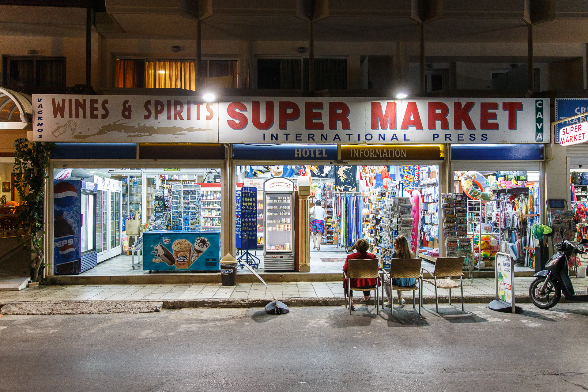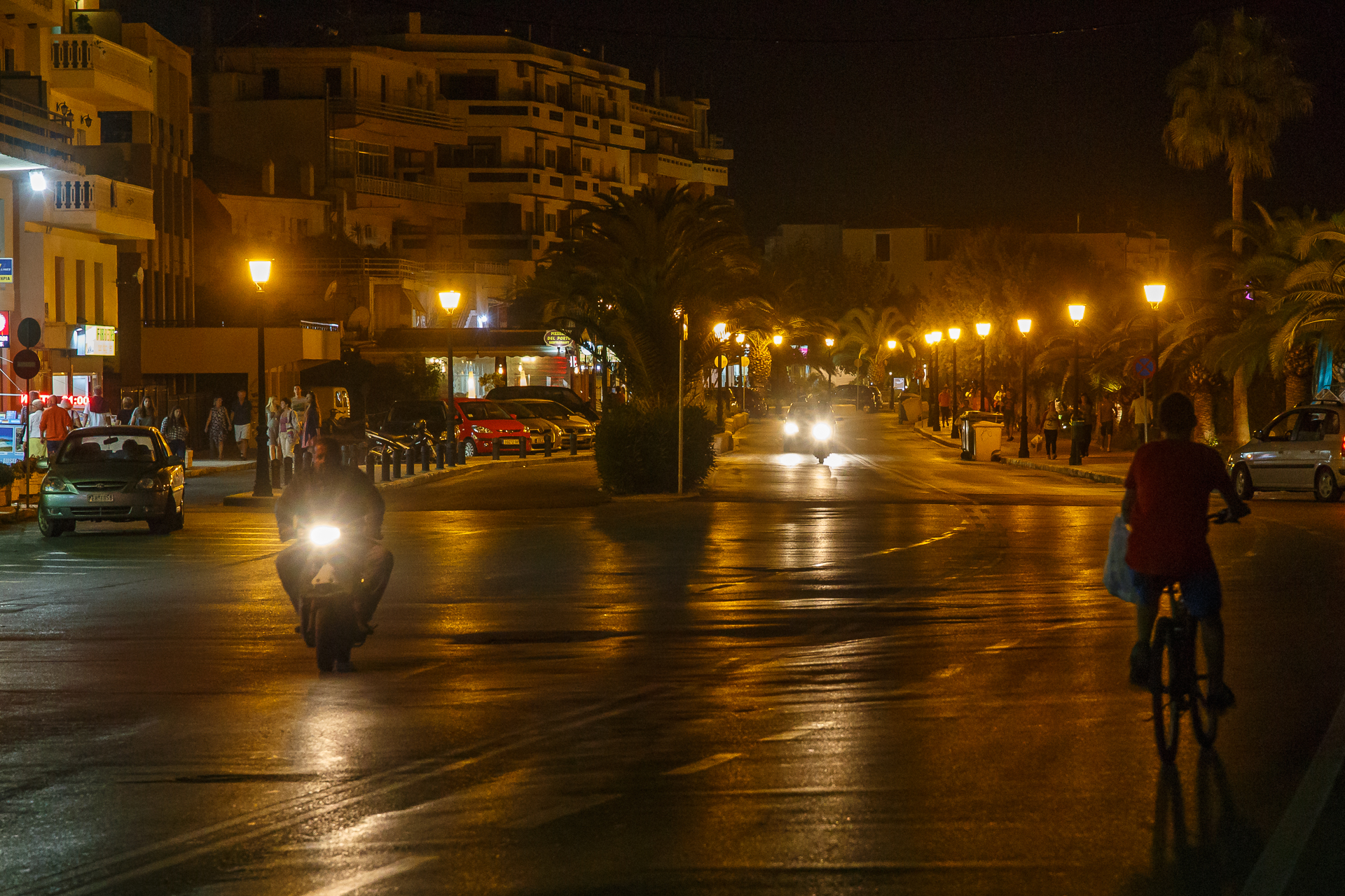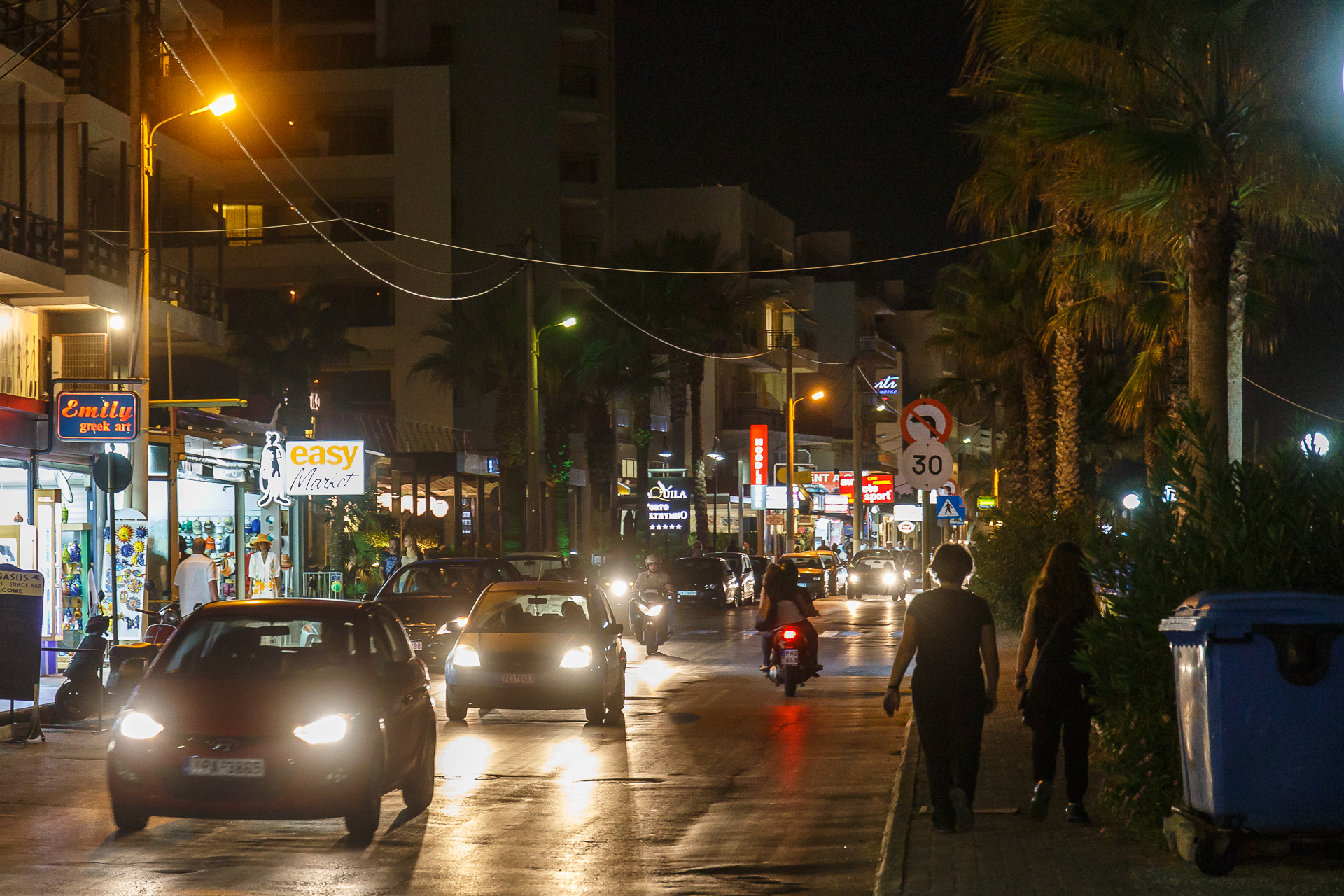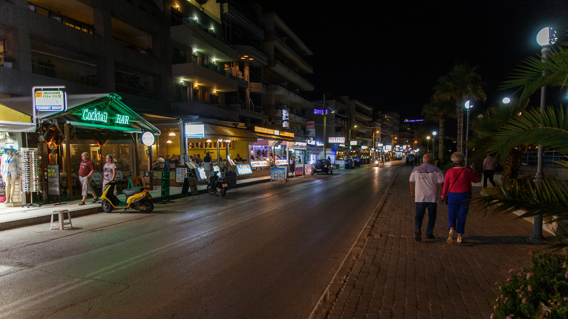 Näin tammikuun loskaisena viikonloppuna on mukava palata muistelemaan viime syksyn Kreetan reissua. Aloitankin tällaisen kaksiosaisen sarjan, jossa julkaisen yökuvia, joita kuvasin kahtena eri iltana Rethymnonissa. Nämä ensimmäisen osan kuvat ovat käsivaralta kuvattuja katunäkymiä. Koska oli pimeää, niin kameran kennon herkkyyttä täytyi nostaa rajusti, jotta pystyi kuvaamaan käyttökelpoisilla valotusajoilla. Ylläolevassa kuvassa iso oli ”vain” ISO3200, mutta alla olevan gallerian neljässä viimeisissä kuvassa se on ”huikeat” ISO12800. Taas on pakko ihailla näitä Canon EOS 6D:n hämäräkuvausominaisuuksia. Kuvassa on herkkyyden noston mukanaan tuomaa kohinaa niin vähän, että kuvat toimivat blogikuvituksen ohella myös vaikka oikeina printteinä. Aikaisemmilla järjestelmäkameroillani Canon EOS 450D ja Canon EOS 550D ISO12800 oli käyttökelvoton. Itse tykkään tuosta Super Market -kuvasta, jossa naiset istuvat kaupan edessä. Miksikähän ne siinä istuvat ja mistä mahtavat keskustella?