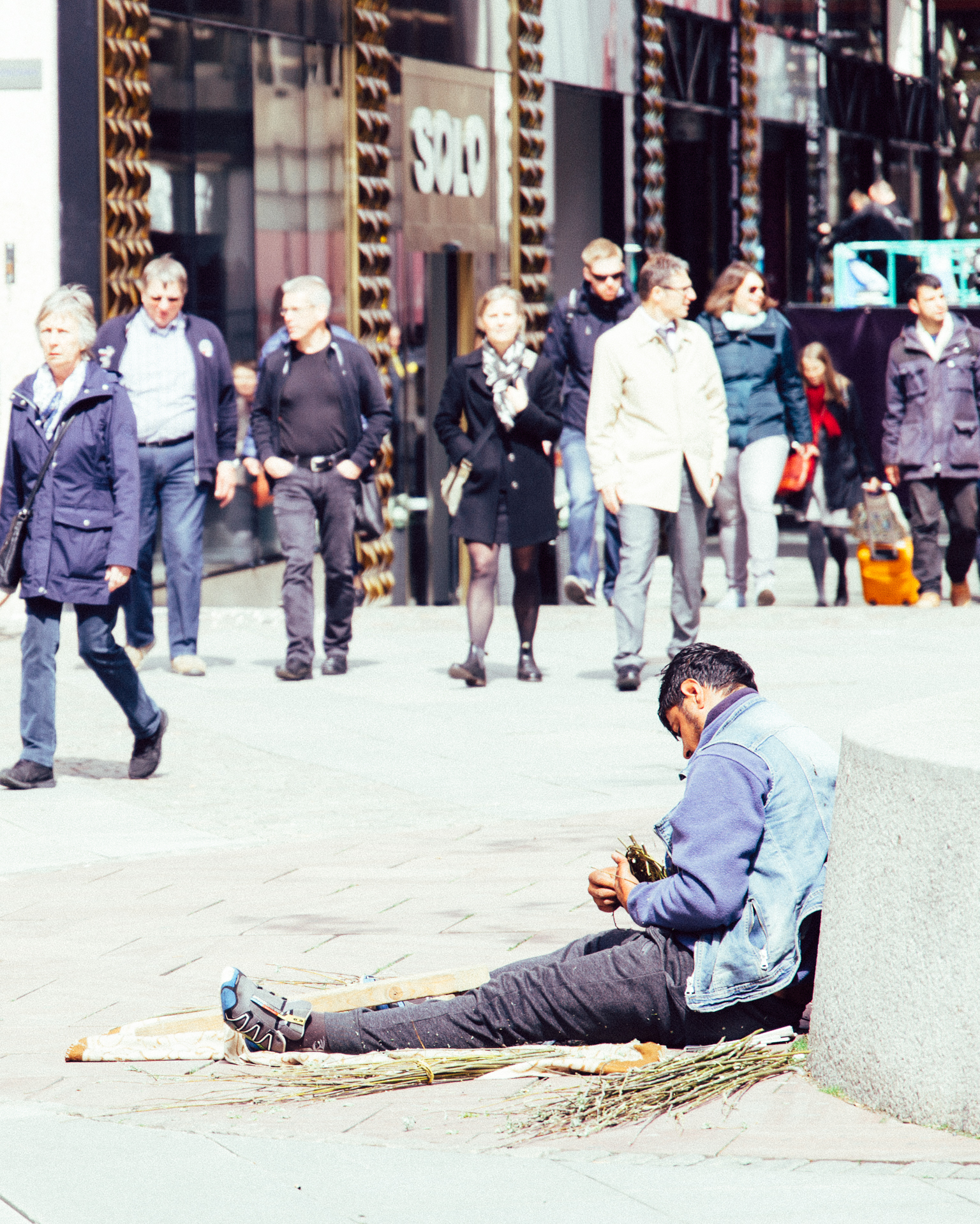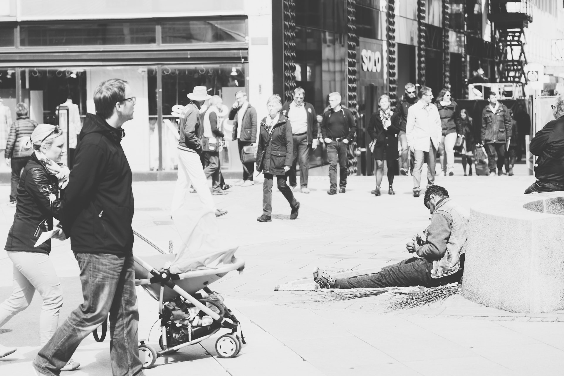 Minulla on kova halu kehittyä katukuvaajana, mutta en vaan millään meinaa päästä yli kynnyksestä, jonka jälkeen vieraiden ihmisten kuvaaminen olisi helppoa. Vieraassa kaupungissa kaupungissa kynnys on tietenkin matalampi. Vielä kun kuvaaminen tapahtuu toisessa maassa, kynnyksen ylitys onnistuu helposti. Katukuvauksessa tuntemattomien kuvaamisesta tulevan jännityksen lisäksi koukuttavaa on se, että se on spontaania, kuvaustilanteet tulevat eteen yllättäen ja on toimittava vaiston varassa. Omasta mielestäni tässä Göteborgissa nappaamassani kuvassa ”Poissa silmistä, poissa mielestä”, ajoitus osui lähes täydellisesti, kaikki katsovat muualle kuin maassa istuvaan onnettomaan mieheen. Äkkiräpsäyksessä rajaus ei tietenkään näin vähällä harjoittelulla osunut, enkä oikein tiedä auttaako kroppaaminen. Kumpi on mielestäsi parempi, alkuperäinen vai kropattu?