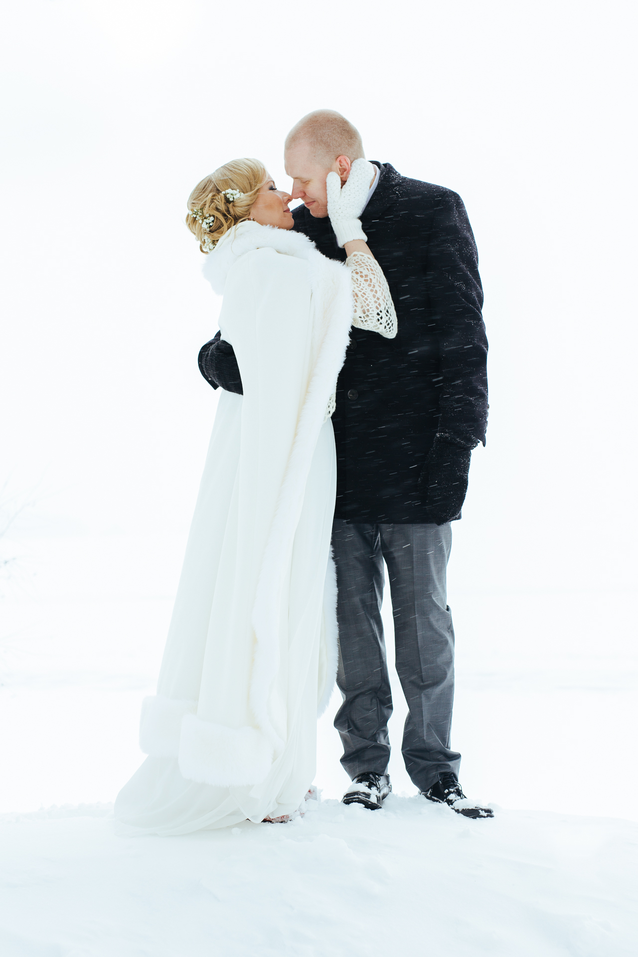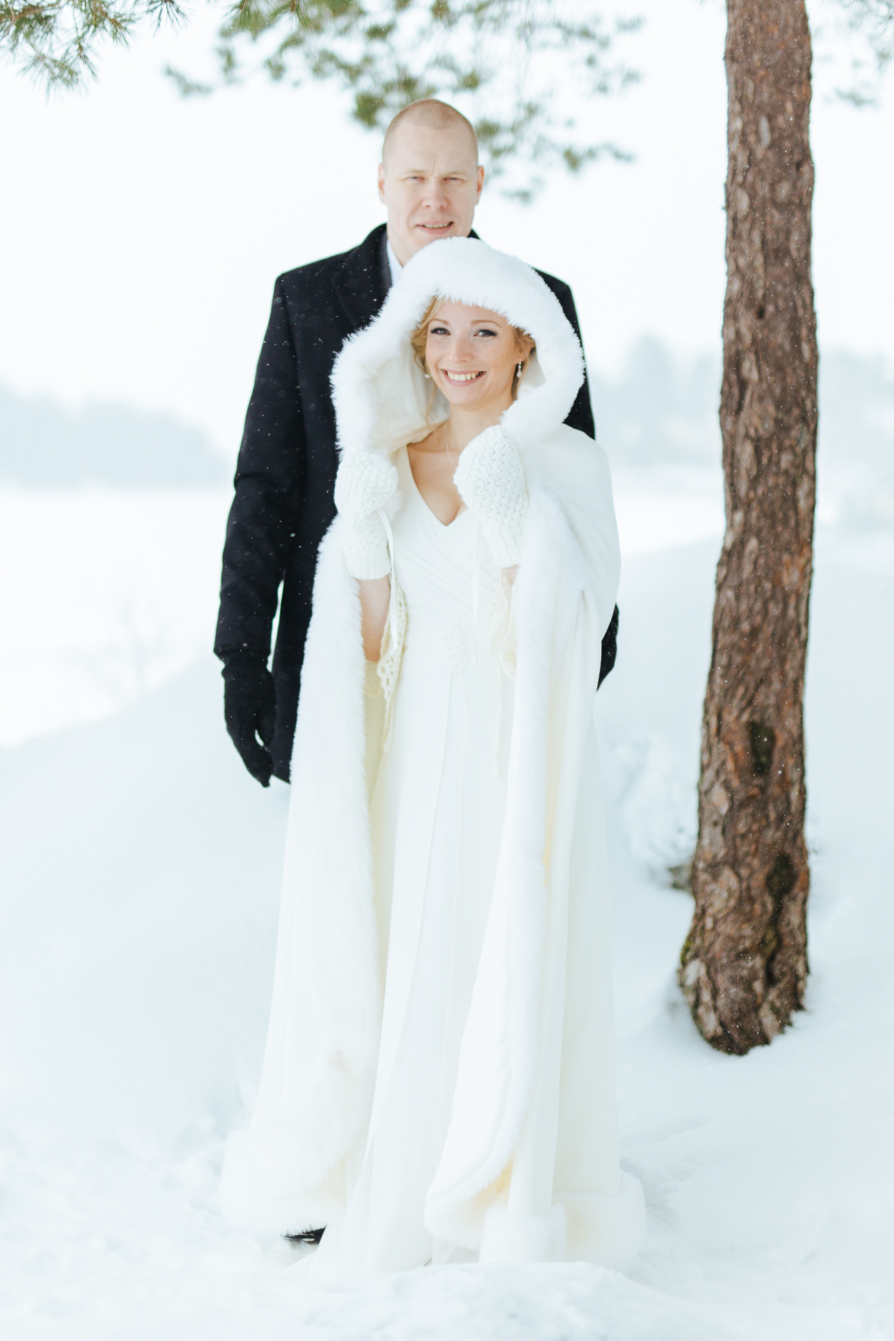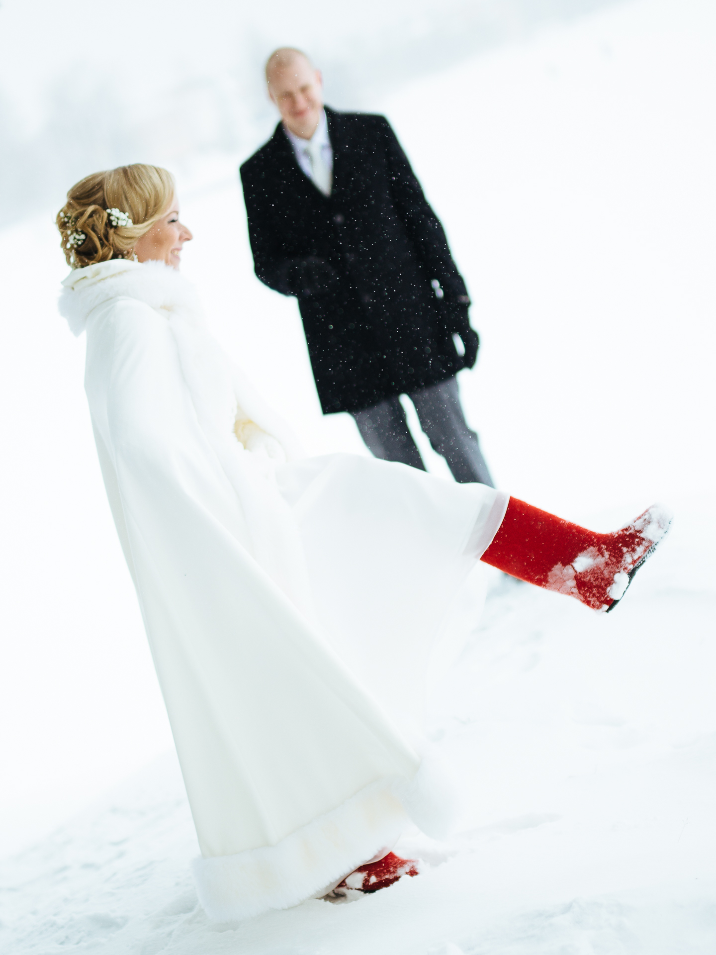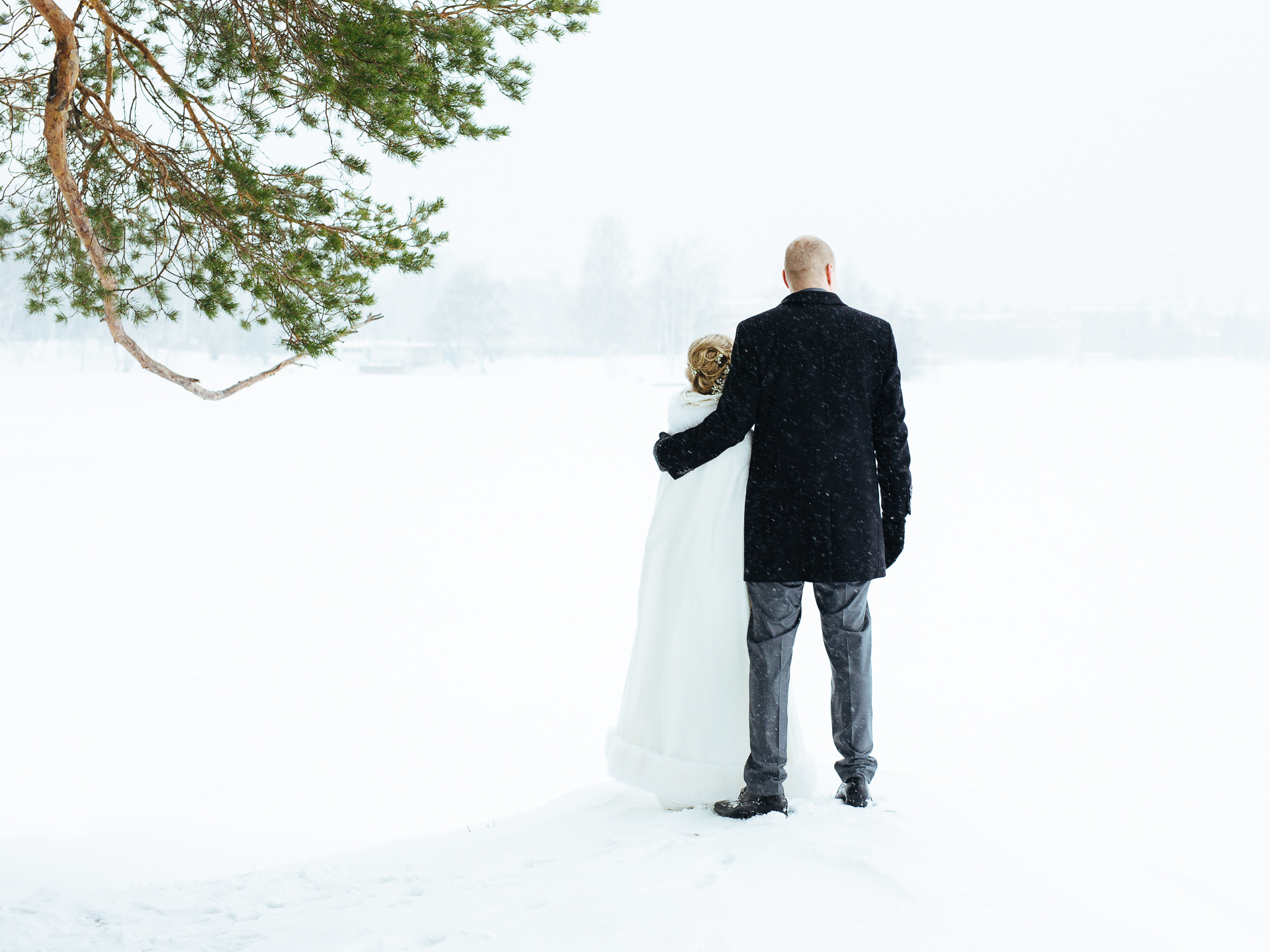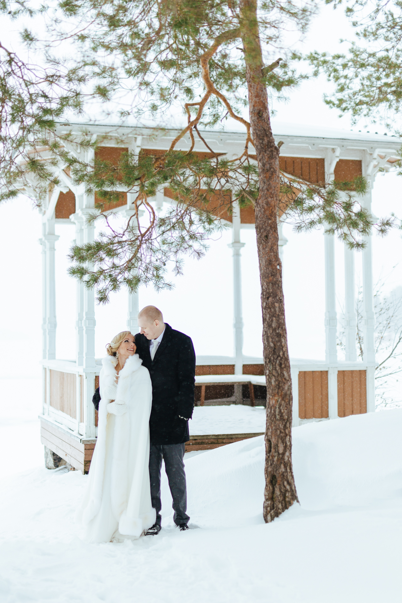 Kuten aikaisemmin kerroin, pääsin harjoittelemaan hääkuvausta muutama viikko takaperin Kuopiossa. Olimme alunperin sopineet, että yritämme kuvata ns. viralliset hääpotretit ulkona mikäli vaan sää suinkin sallii. No, luonto päätti tietenkin haastaa meidät tosissaan ja jouduimme kuvaamaan lumituiskussa. Olihan siinä tuiskussa tietenkin hyvätkin puolensa, sillä valo oli pehmeää ja lumi oli tuoretta sekä puhtaan valkosta, mutta rima nousi heti melko korkealle, sillä kuvaussession oli onnistuttava nopeasti. En halunnut pilata pariskunnan vaatteita enkä myöskään morsiamen kampausta tai meikkiä. Silmiä oli vaikea pitää auki tuulta vasten katsottaessa ja tuuli värjäsi pian posket punaisiksi.