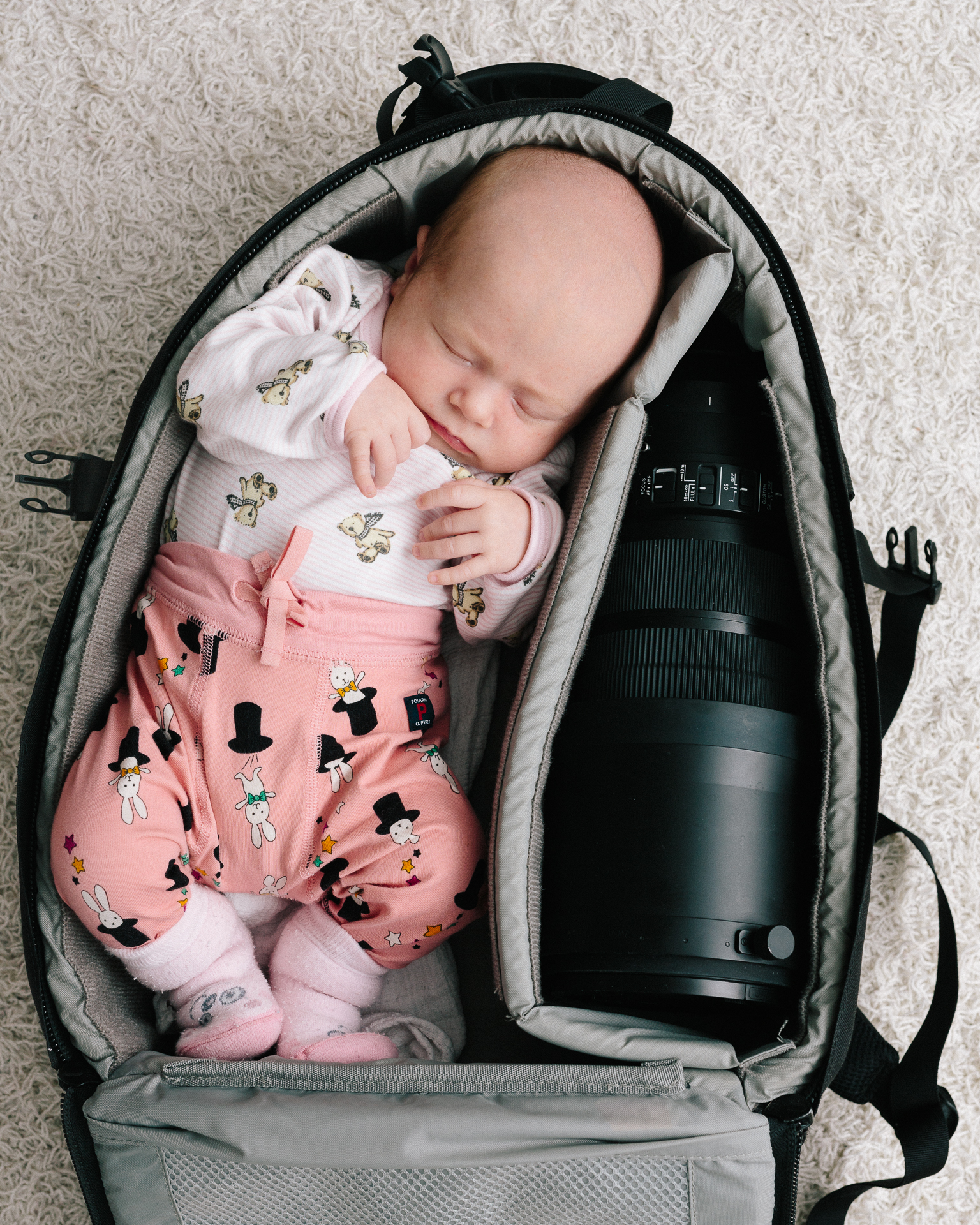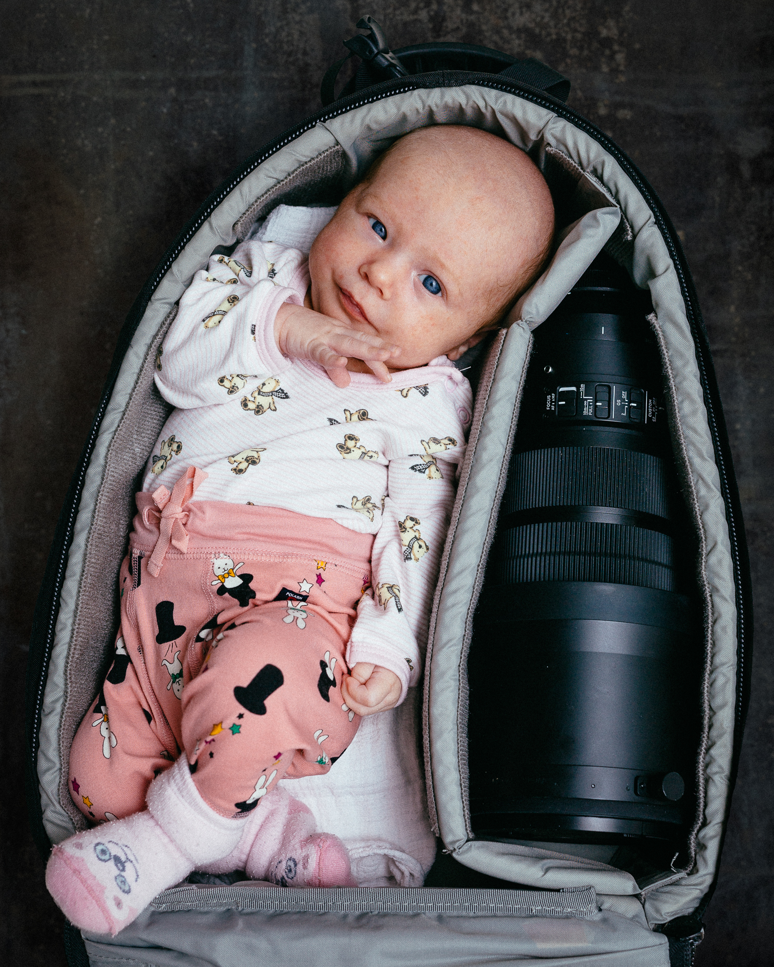 Tunnustan, idea ei ole täysin minun, bongasin sen alunperin PetaPixelistä samoihin aikoihin kuvan tyttö sai alkunsa. Harmittaa, etten muistanut tätä tuoreeltaan reilut kuukausi sitten, jolloin vauva olisi mahtunut paremmin reppuun. Samalla viereen olisi  mahtunut varmasti myös enemmän kamerarompetta…