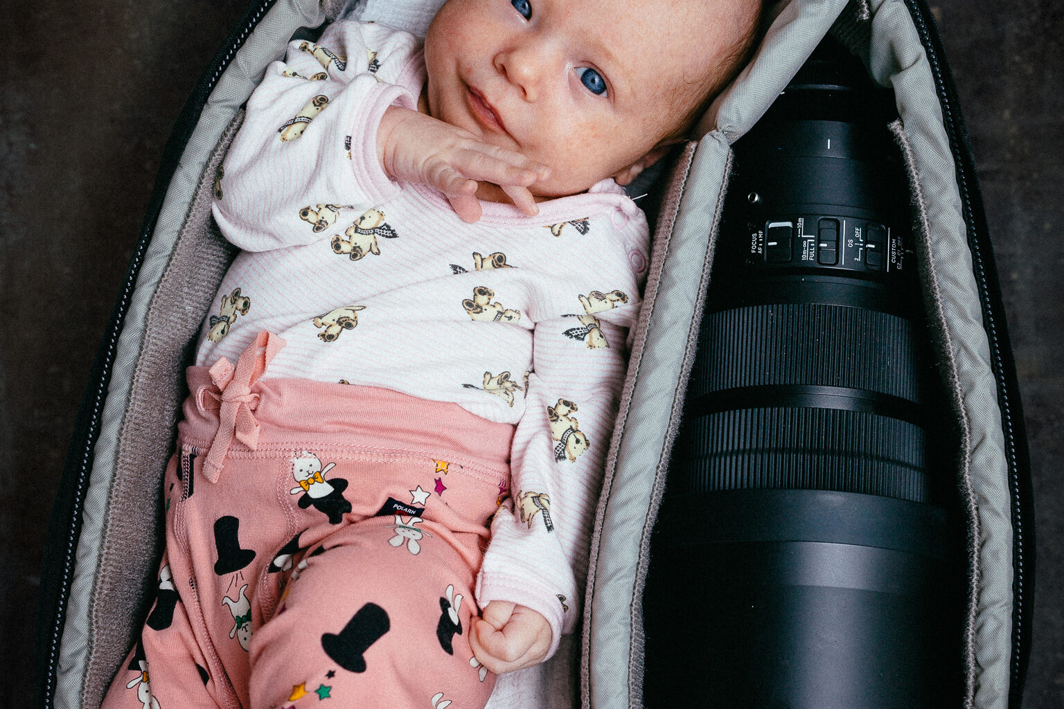 Vauva makaa kuvassa tyytyväisenä kameralaukussa vieressään pisin objektiivini Sigma 120-300mm f2.8 DG OS HSM Sport. Vauva nautti (tai tylsistyi) kuvauksesta niin paljon että nukahti kesken kaiken. Nukkuipa siinä tyytyväisenä (tämän vauvan mittakaavassa) harvinaisen pitkät päiväunet… Siinä vauvan nukkuessa otin myös unikuvia, mutta tykkään kuitenkin enemmän tästä missä hän on hereillä ja katsoo kameraan. Vähän jouduin kuvaa kuitenkin rakentamaan Photoshopissa, sillä laukun alla ollut matto ei mielestäni oikein toiminut kuvissa. Samalla hankkiuduin eroon laukun hihnoista. Alla on kuva nukkuvasta vauvasta, siitä voit vähän hahmottaa mistä lähdin liikkeelle rakentamaan kuvaa. Ylempi kuva on sitten reilun tunnin aherruksen tulos.