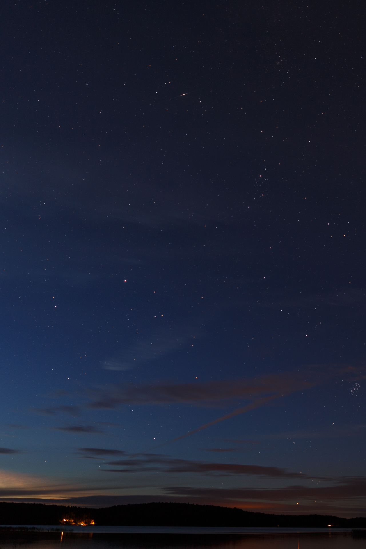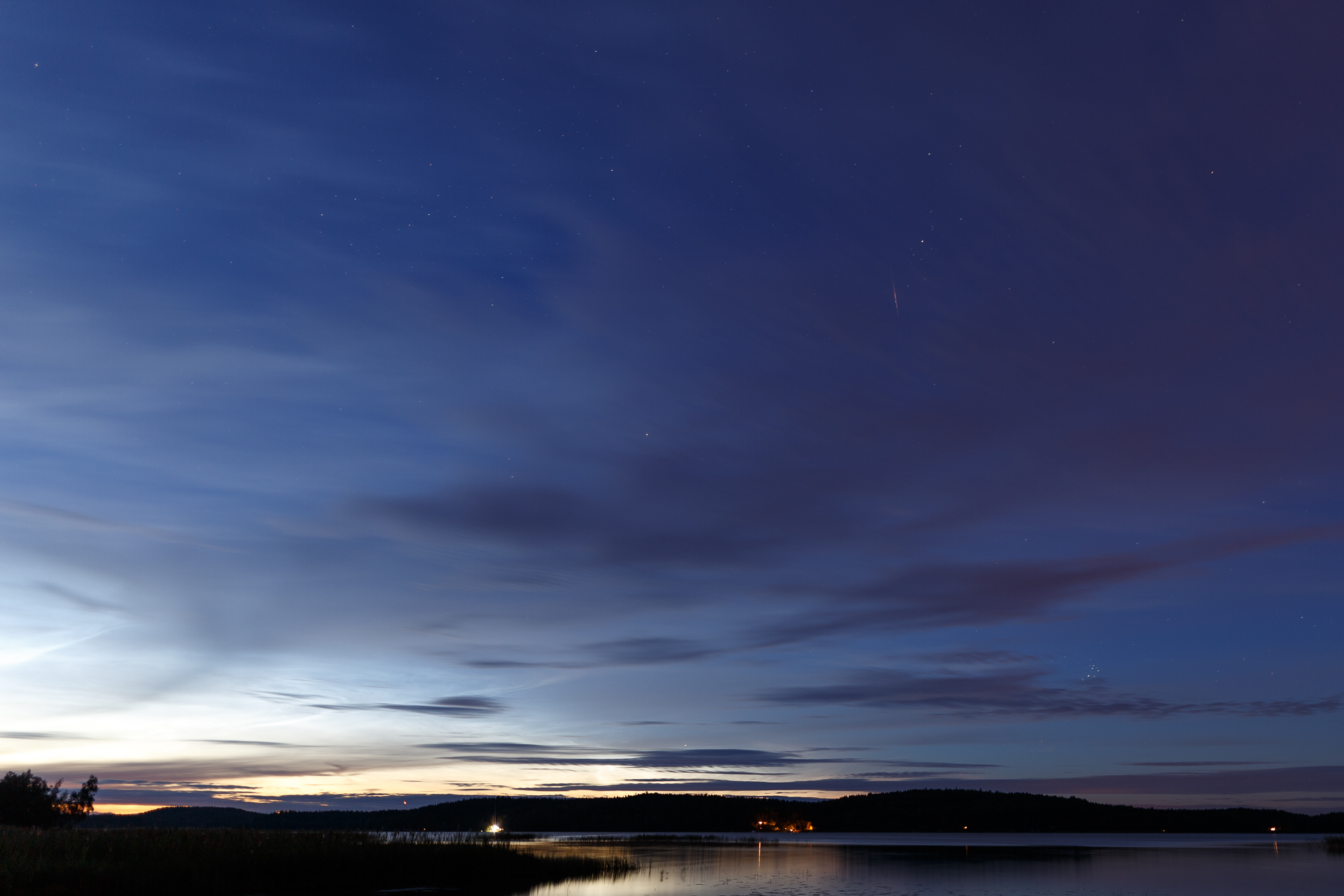 Putkena minulla oli Sigman uusi valovoimainen 20 mm -objektiivi, jota käytin suurimmalla aukolla f1.4. Herkkyydeksi valitsin pienimmän ISO100:n, jotta kuviin tulisi mahdollisimman vähän kohinaa. Tarkoitus oli kuvata pitkiä 20 sekunnin valotuksia. Vaikka yömaisema näytti näillä asetuksilla kuvissa hyvältä, niin voi olla, että 20 sekunnin valotus oli vähän liian pitkä valinta loppukesän ei täysin tummalle taivaalle, osa himmeimmistä tähdenlennoista ei tarttunut kuviin. Valotusajan puolittaminen 10 sekuntiin ja ISOn tuplaaminen 200:aan olisi todennäköisesti tuonut isomman saaliin. Noh, ihan tyytyväinen olen näihinkin, sillä sain saalistettua ihan hyvän kattauksen keskimääräistä kirkkaampia meteoreja.