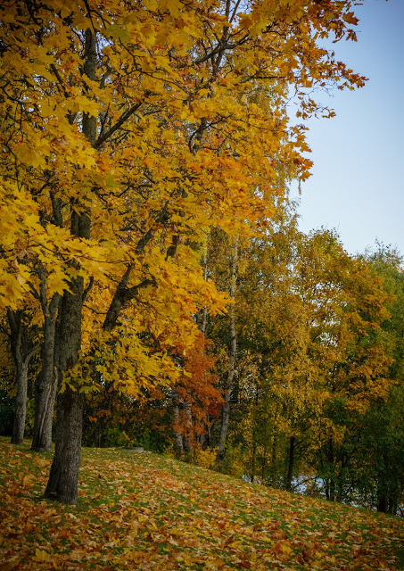 Ehdin jo pelätä, että ruska jäisi lämpimän syksyn myötä täällä Kuopiossa vähän vaisuksi, mutta viikonloppuna luonto räjähti yhtäkkiä upeaan väriloistoon. Otin maanantaina taskuun mahtuvan Sonyn töihin mukaan ja napsin matkalla muutaman kuvan kampusalueelta. Tänään olisi kyllä ollut vielä eilistäkin upeampi aamu kuvata, mutta valitettavasti kamera jäi kotiin…