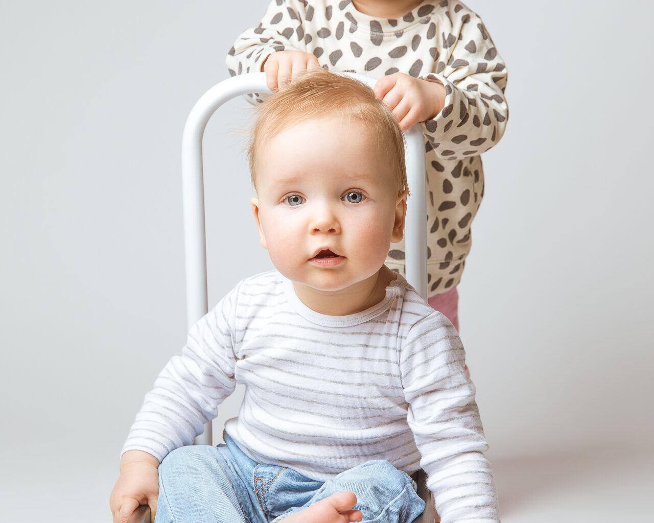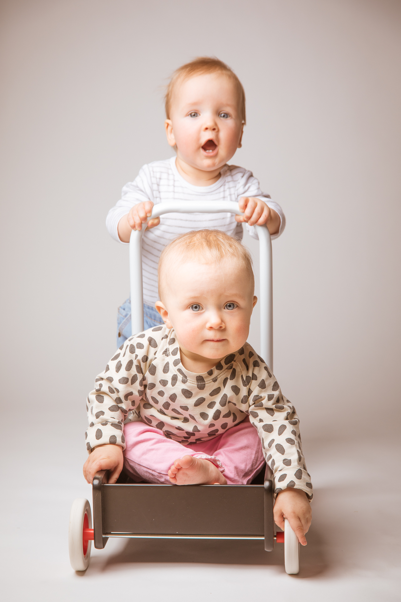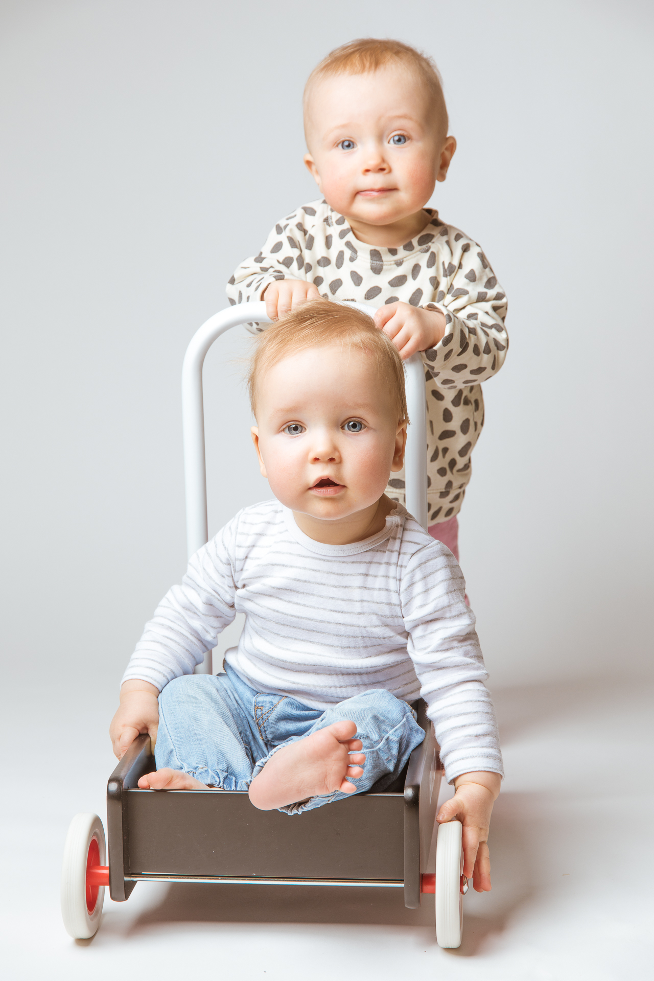 Lauantaina harjoittelin studiokuvausta todella haastavilla malleilla, sillä kuvattavana oli kymmenen kuukauden ikäiset kaverukset. Täytyy sanoa, että vauhtia ja vaarallisia tilanteita riitti, kun kaksi aktiivista vauvaa konttaili pitkin kotistudiota. Vaikka kumpikaan ei vielä osannut kävellä niin jo se, että sai pidettyä molemmat lapset kuvausalueella salaman valossa, tuntui väliin mahdottomalta tehtävältä. Vaikka keinot omien tyttärien viihdyttämiseksi tunnen hyvin, niin etukäteen tuntematon vauva toi valtavasti uusia muuttujia kuvaussessioon. Täytyykin kasata pikatahtia lisää vauvan viihdytyskikkakolmosia takaraivoon ja rekvisiittaideoita selkärankaan ennen kuin seuraava vauva tulee studioon.
